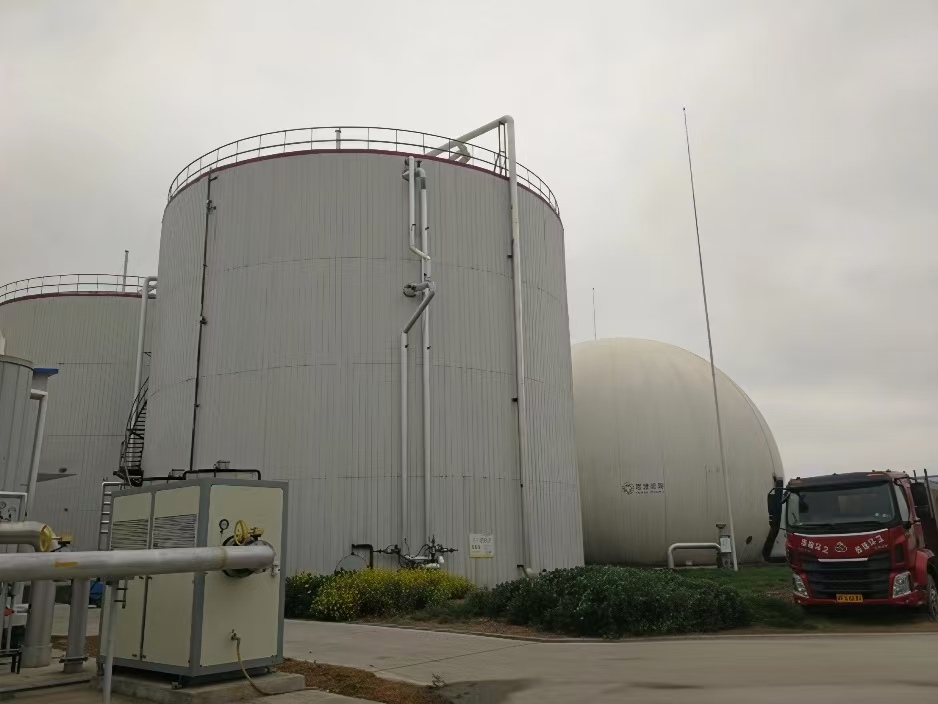 工厂参观结束后,我司团队进一步陪同客户到由我司参与建设的海安生物沼气项目实地考察,海安生物沼气项目是一项综合性的环境保护和可再生能源计划,落地于海安县曲塘镇胡庄村,占地16533平方米,项目投资6900万元,设计建设15000立方米厌氧发酵,其中5000m³采用传统顶入式搅拌混料方式,10000m³采用我司设计的丹麦Gasmix水利循环技术,通过6年的技术对比水利循环技术无论是在产气量还是破壳方面更胜一筹,效果达到了客户超期效果。我们的团队向台湾客户重点介绍了装配式厌氧发酵罐在施工、建设过程中的效率以及优越的防腐性能。包括模块化设计、安装周期短、制造质量可控以及容量扩展灵活等特点。这些特性使拼装式储罐在大规模环境清洁项目中具有良好的适用性。